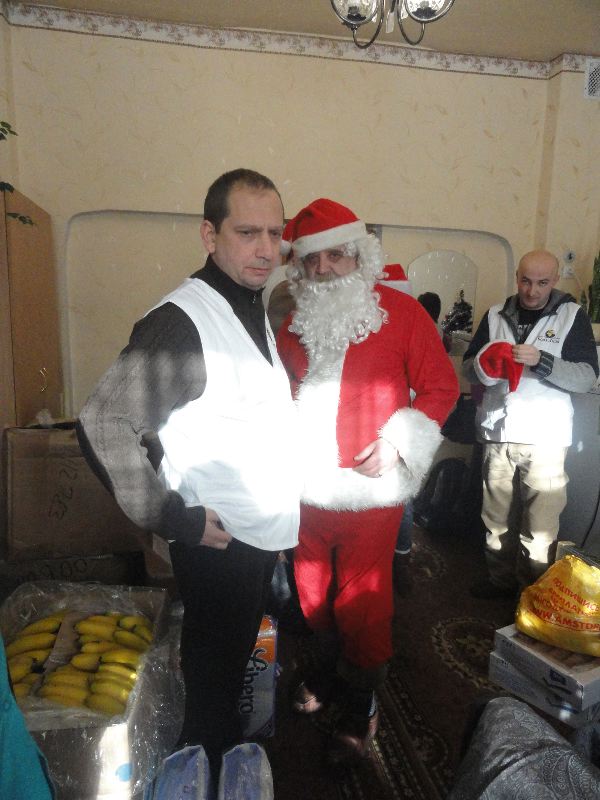 Volunteers of His Kids Too! prepare to deliver cookies (on the right), bananas (to the left), and boxes of clothing in the background