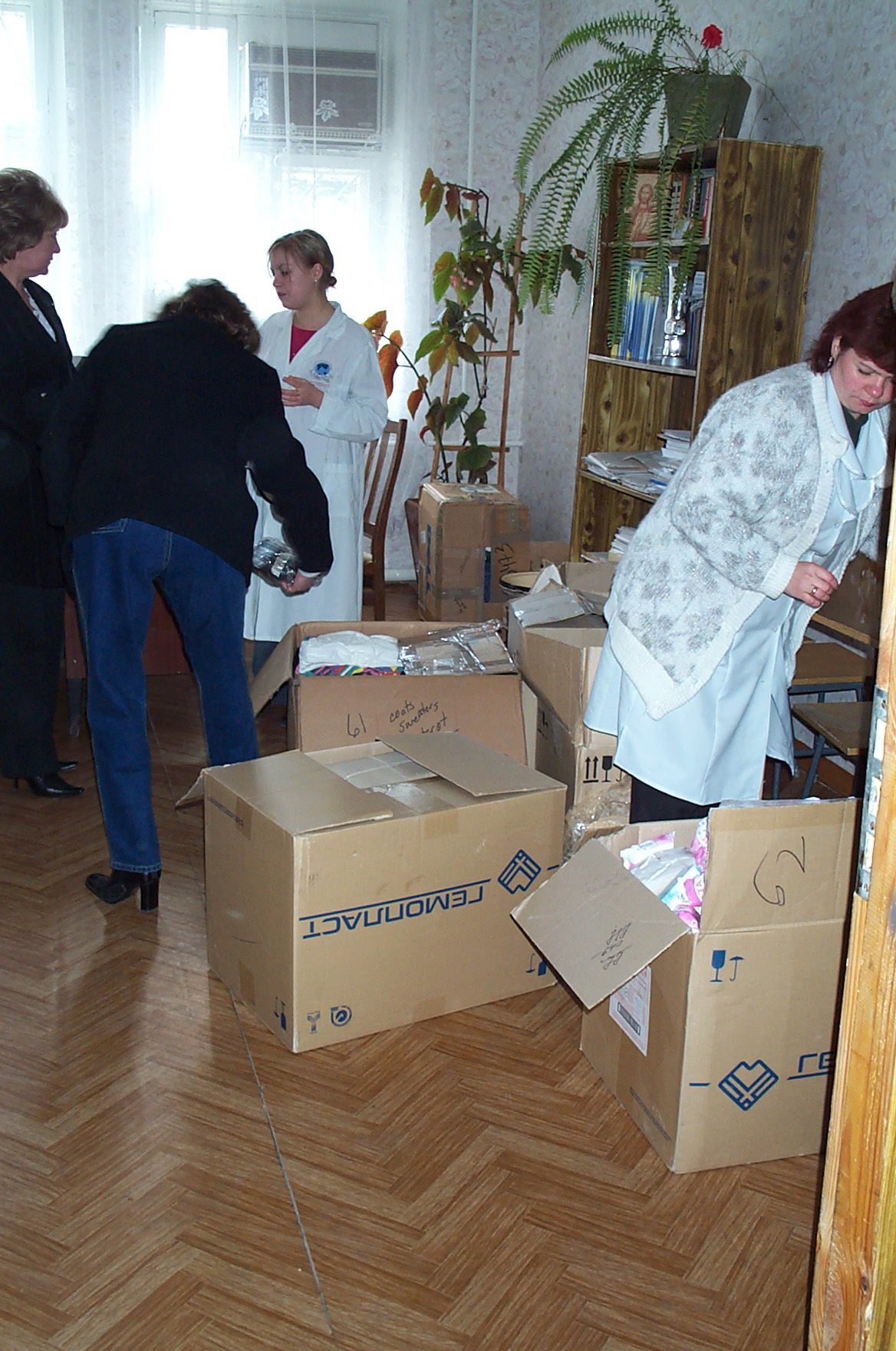 Opening boxes of aid for the facility, Fall 2004